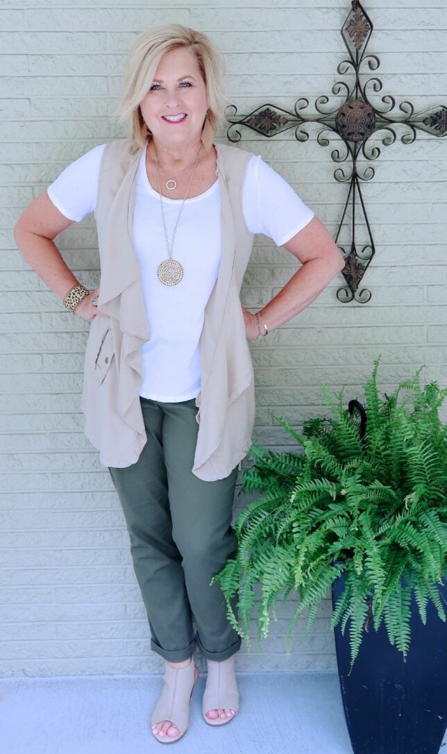 My pants are a classic chino material with a modern update in the form of this utility-inspired pant. They feature a cropped and cuffed hem and stretch knit fabrication. I feel like these are similar to a boyfriend style because they are looser in the fit that a lot of pants. I am wearing my usual size 10, which fits great. I have not washed these yet, so they could shrink up some since they are 98% cotton and 2% spandex. I bought these at Cato Fashions when I purchased the vest. Here is the link, and the color that I am wearing is Oregano. My leather shoes are by Clarks Collection, and they are called the Valeri-Jane. I like the perforated upper, a peep toe, an ankle hook-and-loop closure, and they have a padded insole and a textured outsole. They fit true to size; I am wearing my usual size 9.