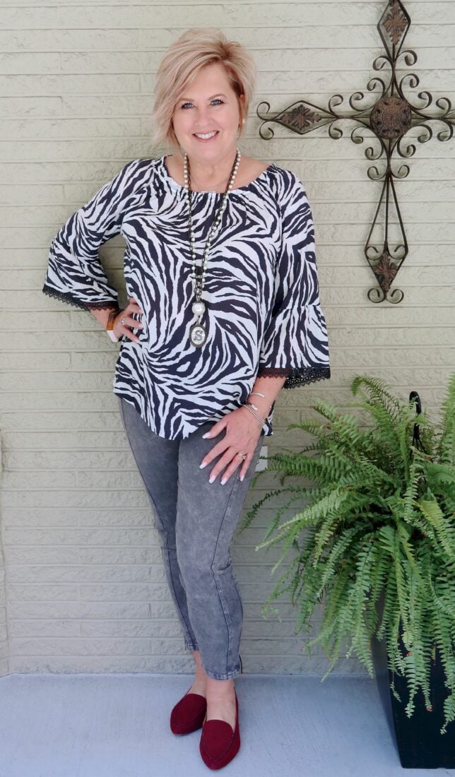 I fell in love with the faded gray colored jeans when I bought a pair from Old Navy, and they are still one of my favorite pairs of jeans. I bought this cute pair of Umgee jeans at a local boutique for those days when my ON jeans are dirty. I loved that they were pull-on jeans (doesn’t everybody over 20) and I liked that they had the seams down the sides to give them unique details. Umgee is a brand that is normally sold in boutiques, so I had to find you “similar” jeans for my links. The wine loafers have quickly become one of my favorites. I like the ease of slipping them on, plus the rich color is perfect for fall. I bought these online from Walmart, and here is the link. PS: I am wearing my usual size, so these run true to size.