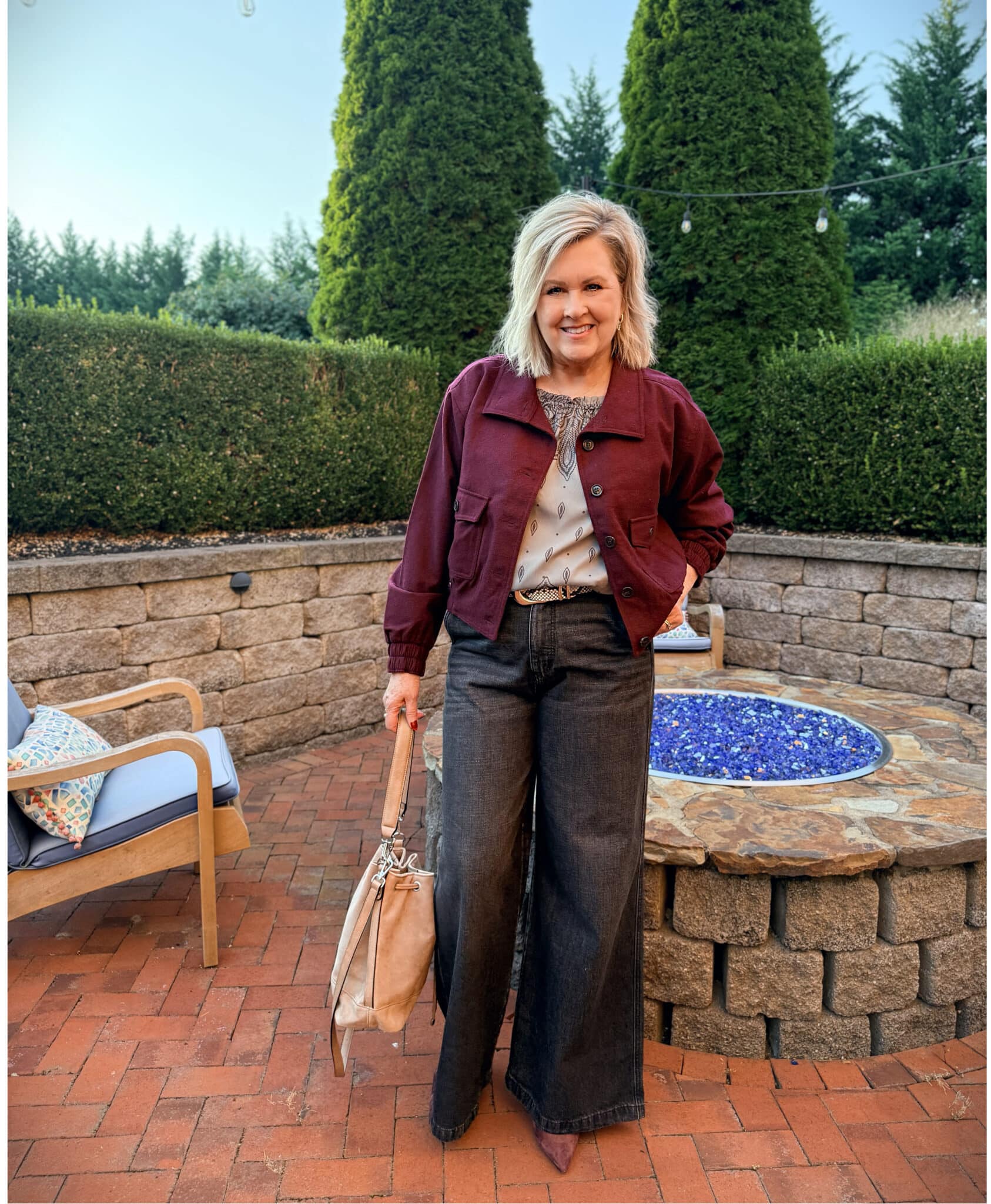 To finish things off, I added a tan bag that matches my shoes. Coordinating your accessories is a little styling trick that makes your outfit feel intentional and pulled together. It also lets the burgundy really shine as the focus of the look.