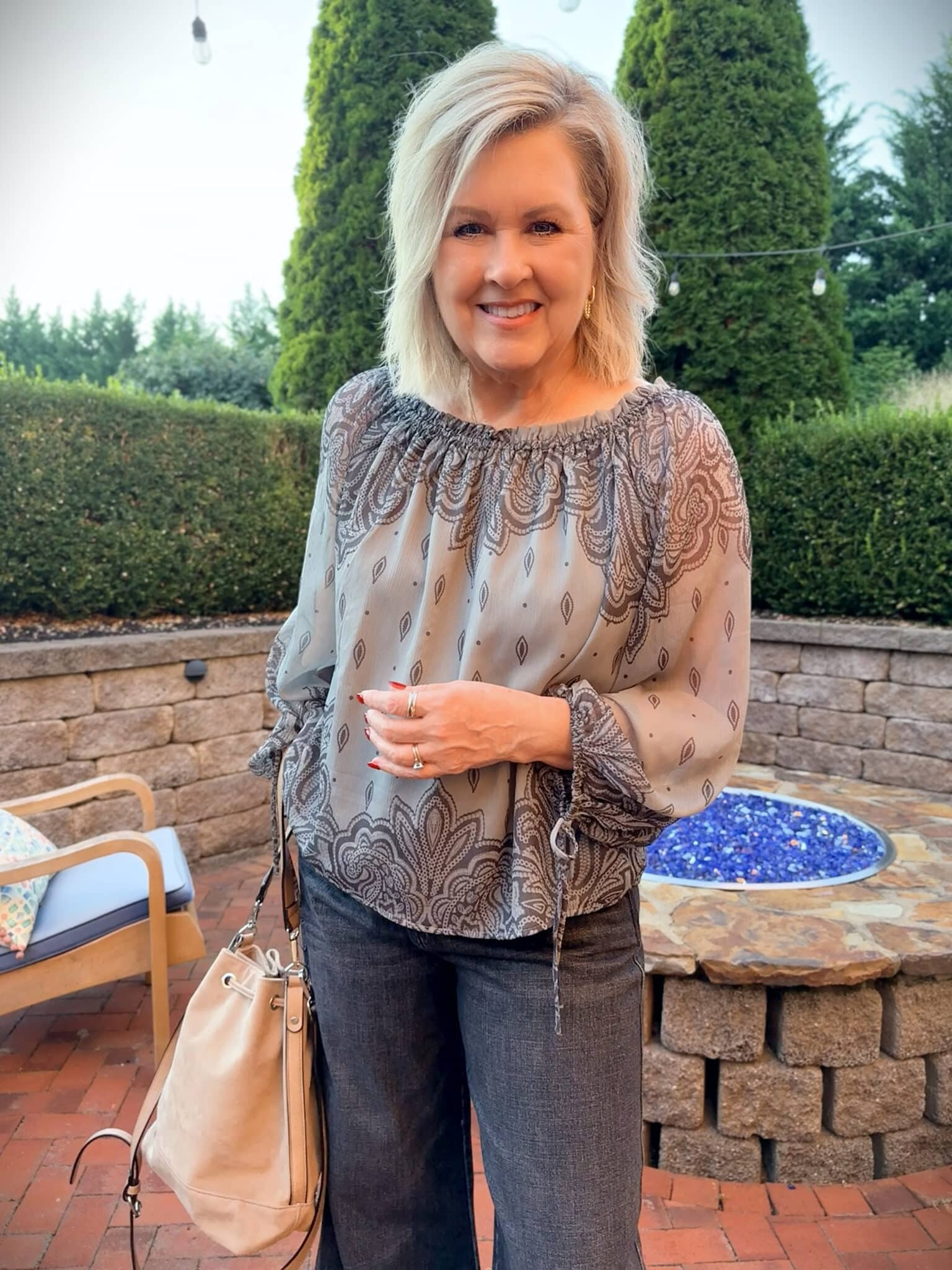 Love the paisley blouse and the burgundy jacket.