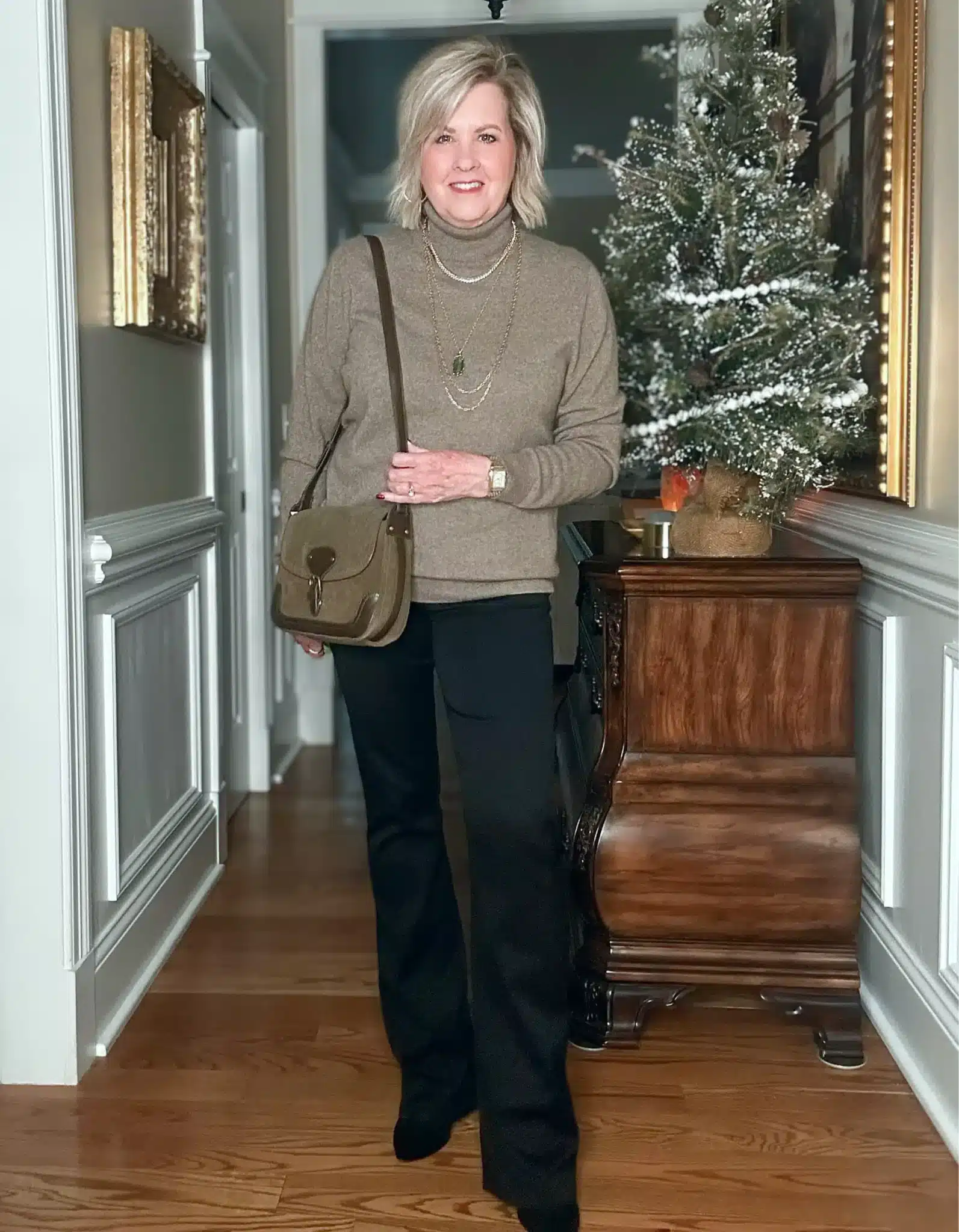 WOMAN OVER 50 WEARING A SOFT CASHMERE SWEATER FROM QUINCE WITH BLACK PANTS FOR WINTER FALL