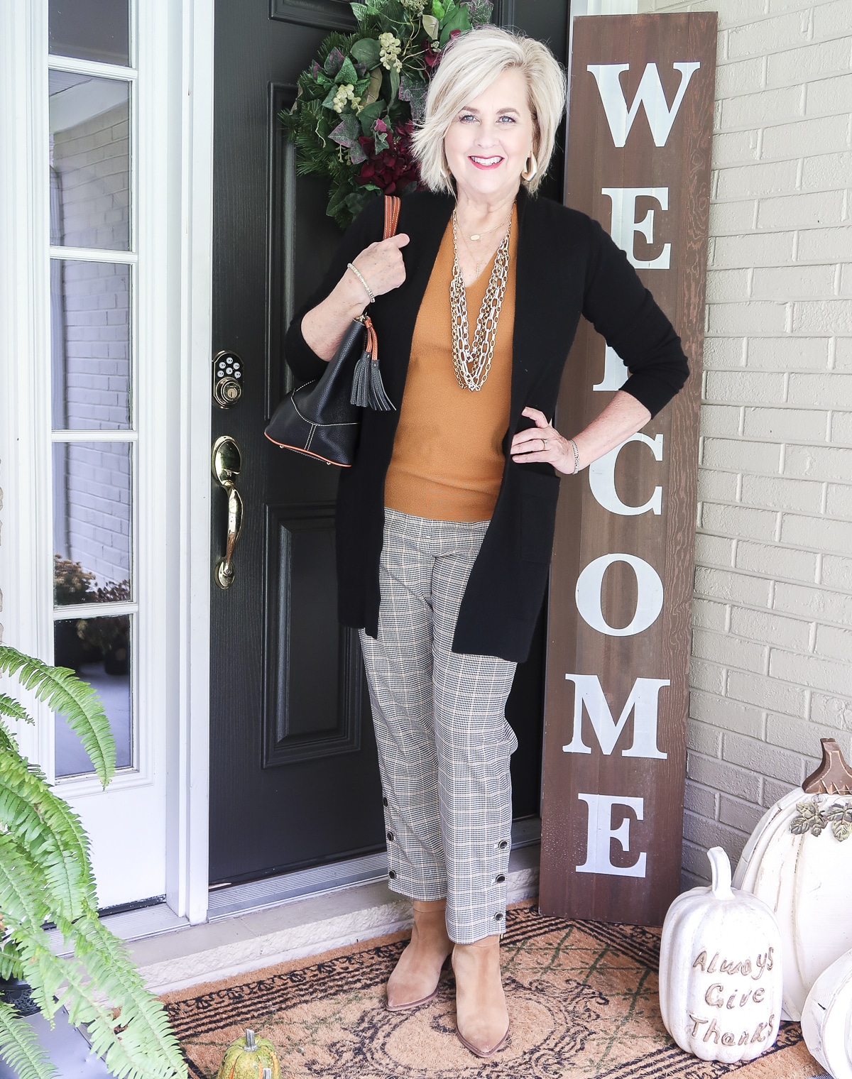 I have been crushing on this caramel color all fall long! This is not normally a color that I gravitate toward, but I can’t get enough this year. When I find something that I like, then I tend it buy it in several colors. That has happened with this cap-sleeved v neck sweater. I already own this sweater in a couple of other colors that they came out with early this fall, and I recently bought a blue one as well as this ginger-colored one. I love the style of this sweater, and I think that it is very flattering. The slight cap sleeve looks great when you wear it alone, and since it is almost sleeveless, it goes great under a blazer or cardigan. I am wearing a large since the sweater is fitted, and I think that this size fits me nicely.