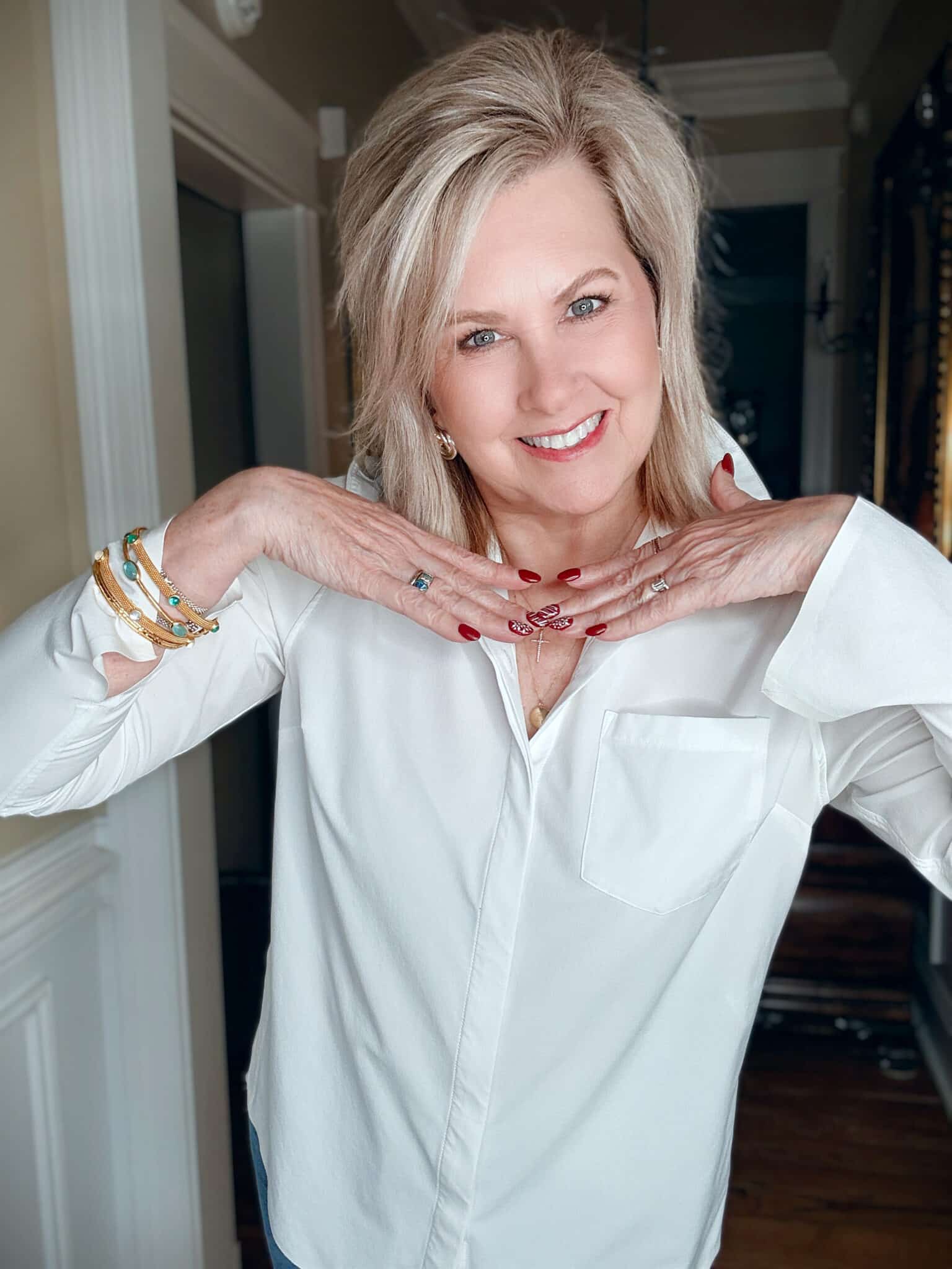Then I go in with the lip gloss, but only in the center of my lips. This is my little trick to keep lips looking fuller without looking shiny or sticky. I press my lips together once, and that’s it. The gloss adds softness and comfort without sliding all over my face, which is something I refuse to deal with at this stage of life. Lol!