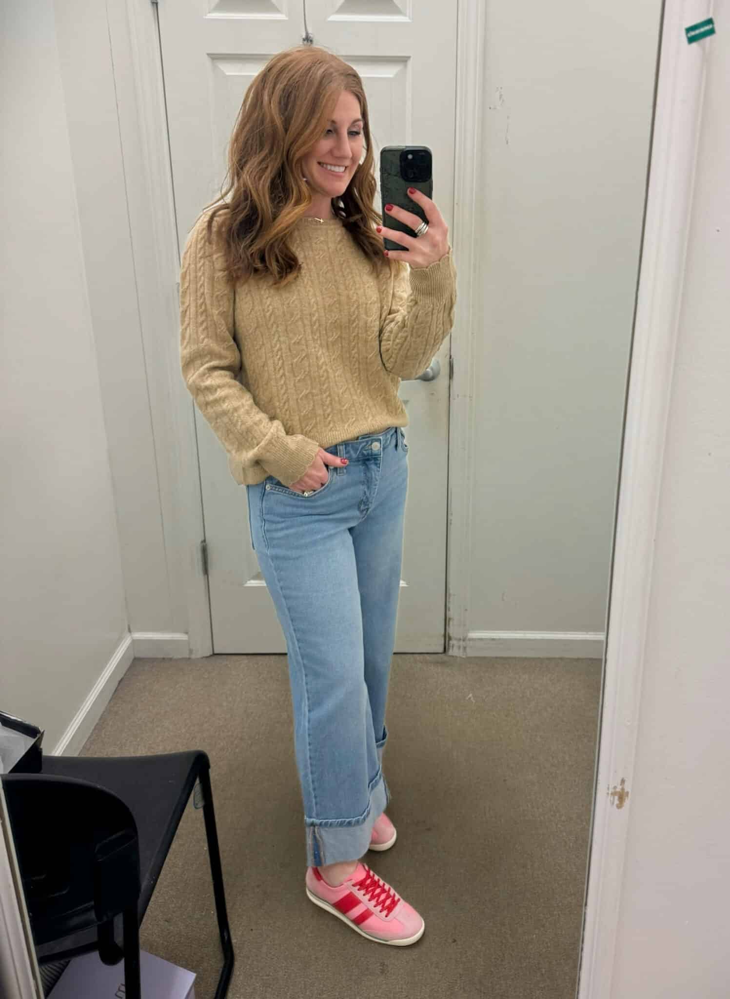 The latte Scallop Trim Cable Knit Sweater (medium) has a soft, classic look that doesn’t feel stiff or fussy, and the petite-friendly Rolled Wide Leg Jeans (size 6P) actually sit where they’re supposed to. That alone is worth mentioning.