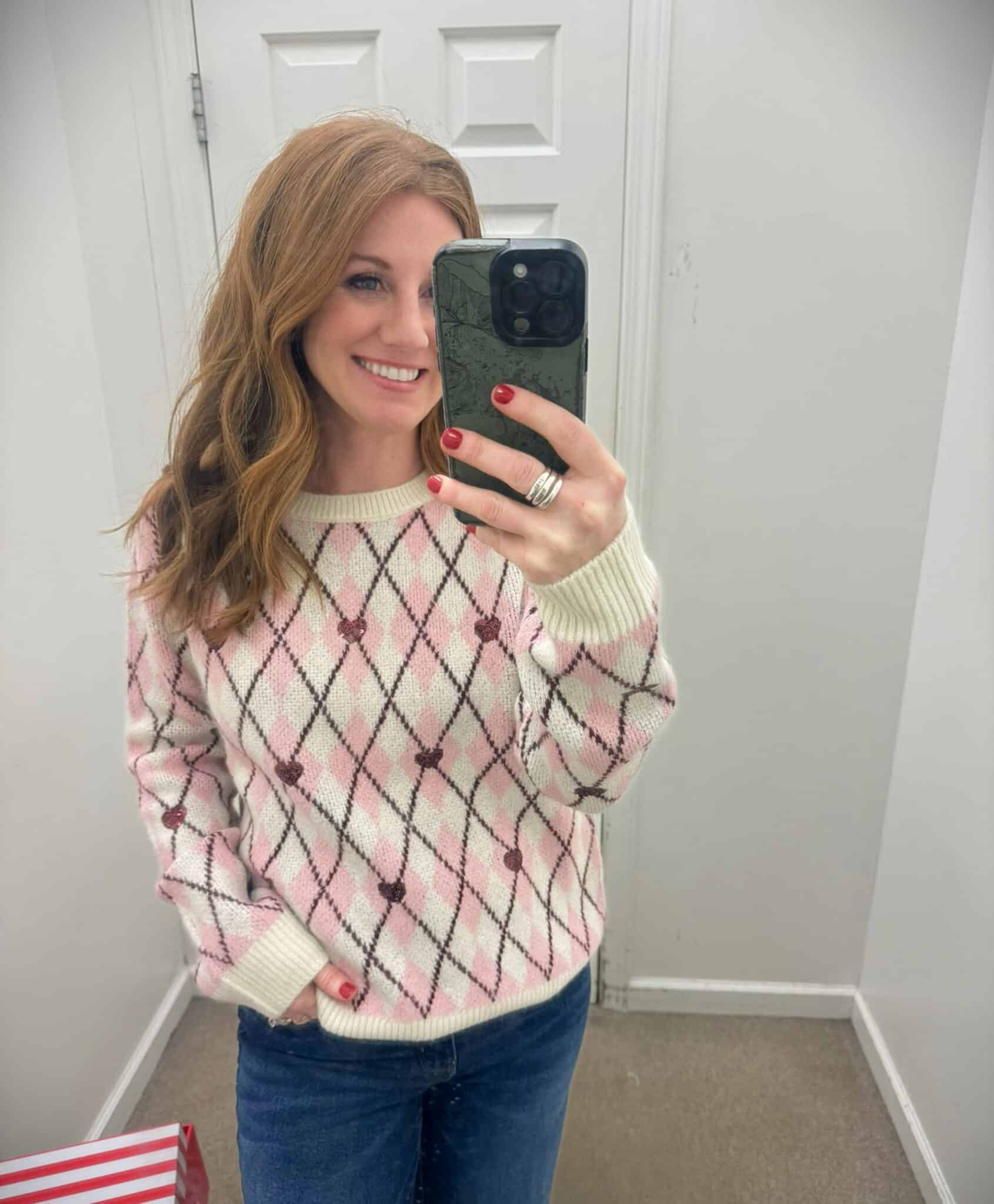 The Argyle Heart Crew Neck Sweater is perfect for Valentine’s Day. The argyle pattern gives it structure, and the heart detail keeps it from feeling stiff or preppy. On a petite frame, patterns can be tricky, but this one didn’t overwhelm her at all.