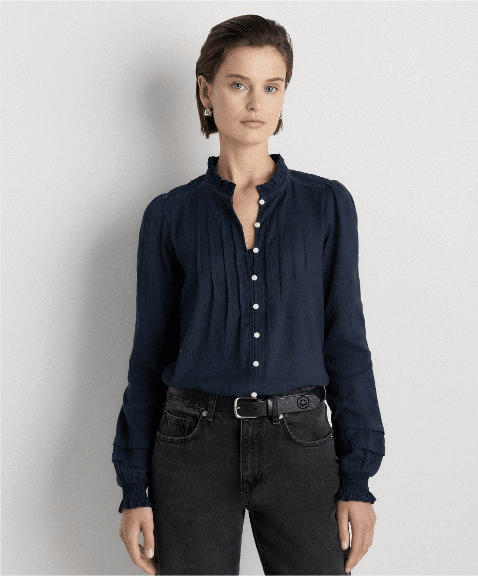 This cotton peasant blouse has a softer, more relaxed feel. The shape is easy and forgiving, which makes it very comfortable to wear. I like pairing tops like this with structured bottoms to balance things out. It’s feminine without feeling overly sweet.