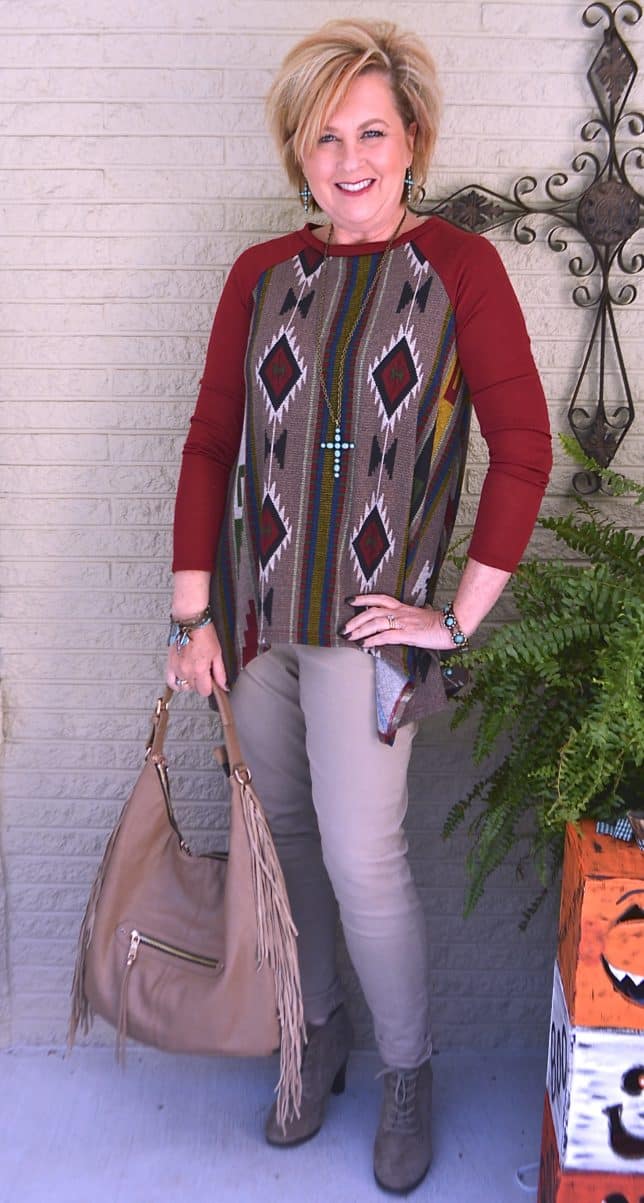 These are some old photos that I found on one of my SD cards, so I decided to go ahead and use them. The pumpkins and the fern that stills looks alive are dead giveaways. Haha! I am wearing a top that I have had for a while but I don’t wear often. I am not a huge fan of the Southwestern style, it is just not a pattern that appeals to me. I see others wear this style and I like it on them, but it just seems to fall flat on me.