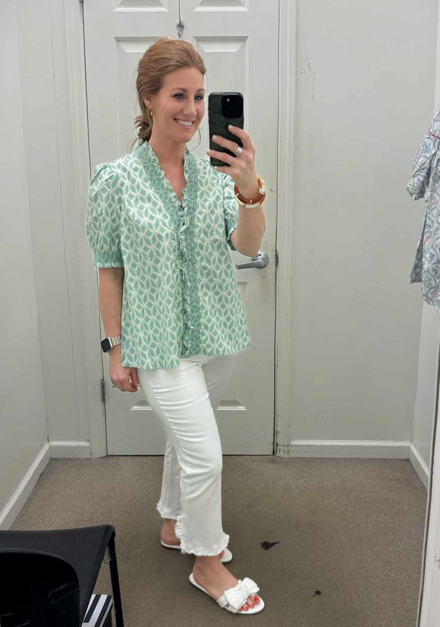 The Perfect Pop of Green: Smocked Ruffles & Cropped White Denim