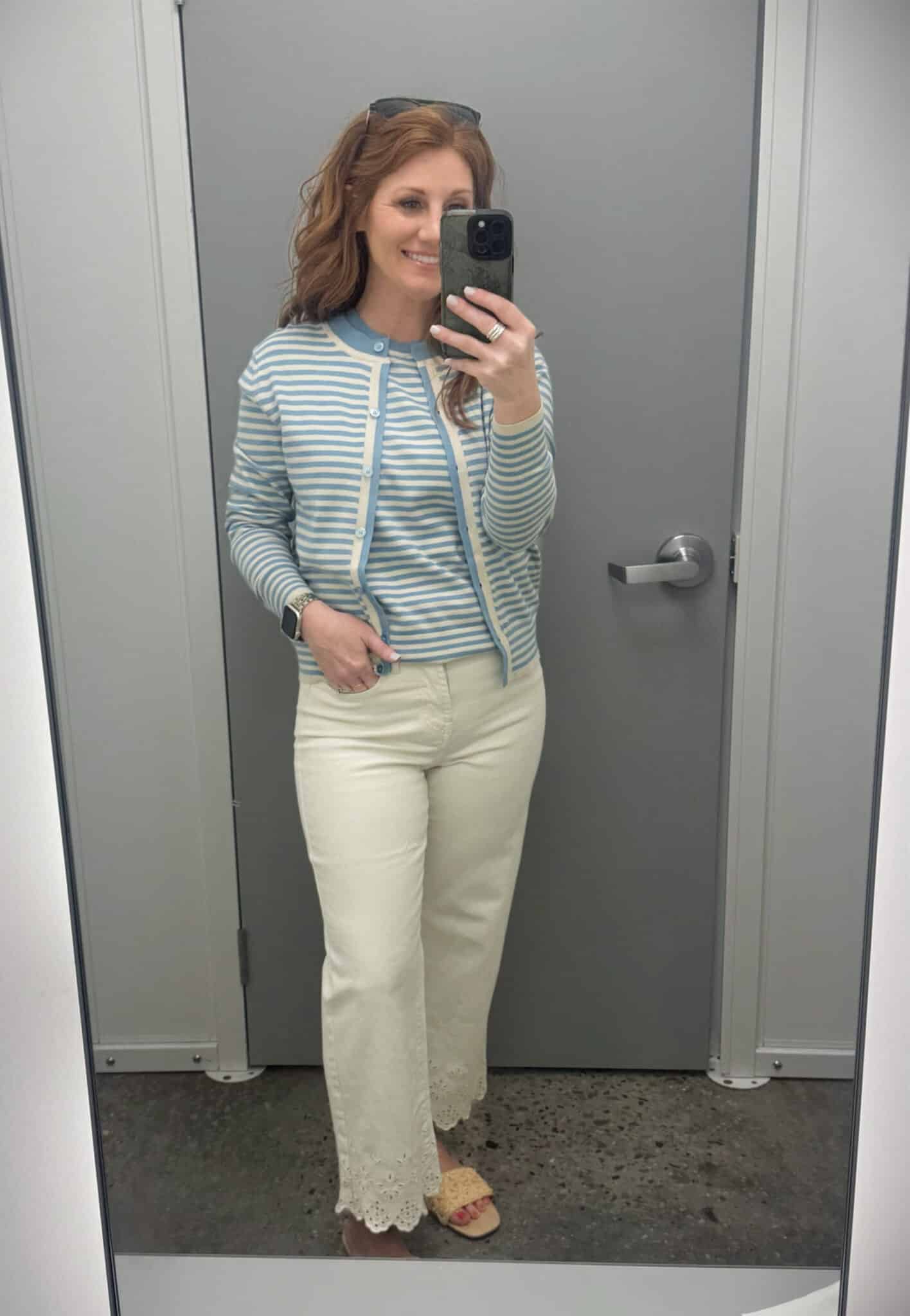 This striped sweater set is made from a super-soft knit that’s perfect for those transitional spring days. It’s a “twin set” style with a sleeveless tank underneath and a matching button-front cardigan on top. The pieces are sold separately, so you can mix and match them! Stephanie is wearing a size Small and says it runs true to size. She paired them with cream-colored, straight-leg jeans that hit right at the ankle, a perfect fit for a petite frame. The star of the show is that gorgeous laser-cut scallop hem!