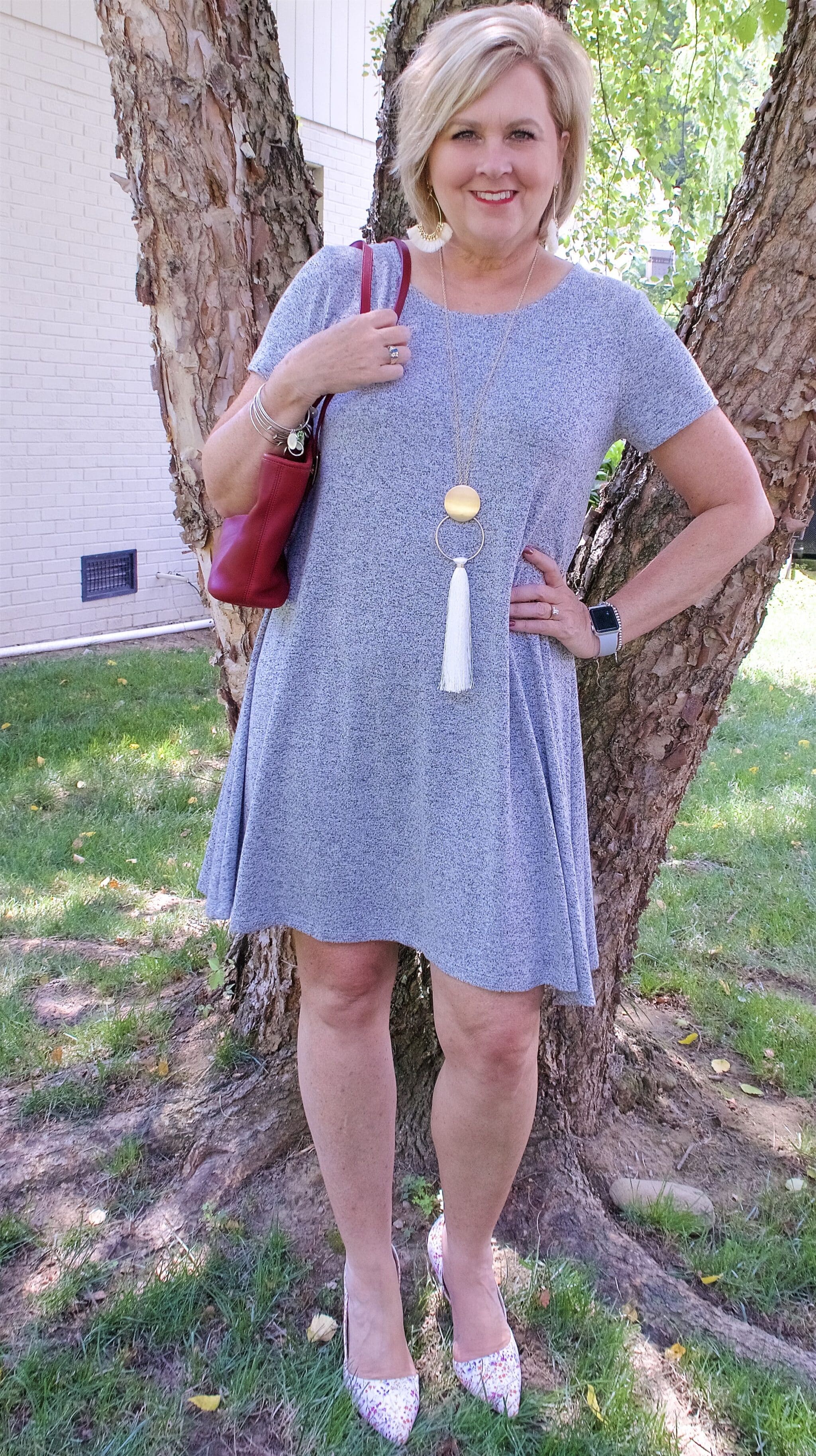 I love this soft swing dress from Old Navy. I bought this dress earlier in the year in a different color and here is where I wore it. This dress is a plush knit and it is so soft. I really like this dress even better than the other swing dresses that I had previously bought from Old Navy. I think it is the plush knit fabric that I liked so much, it just feels luxe. This dress is a short sleeve version but I would recommend going ahead and buying the long sleeve version (it is on sale) for the upcoming fall season. Plus, if you are like me, then you can push up the sleeves for spring. Go HERE to view that option, and it comes in 4 different colors. You’ll want more than one, especially at that price. Lol!