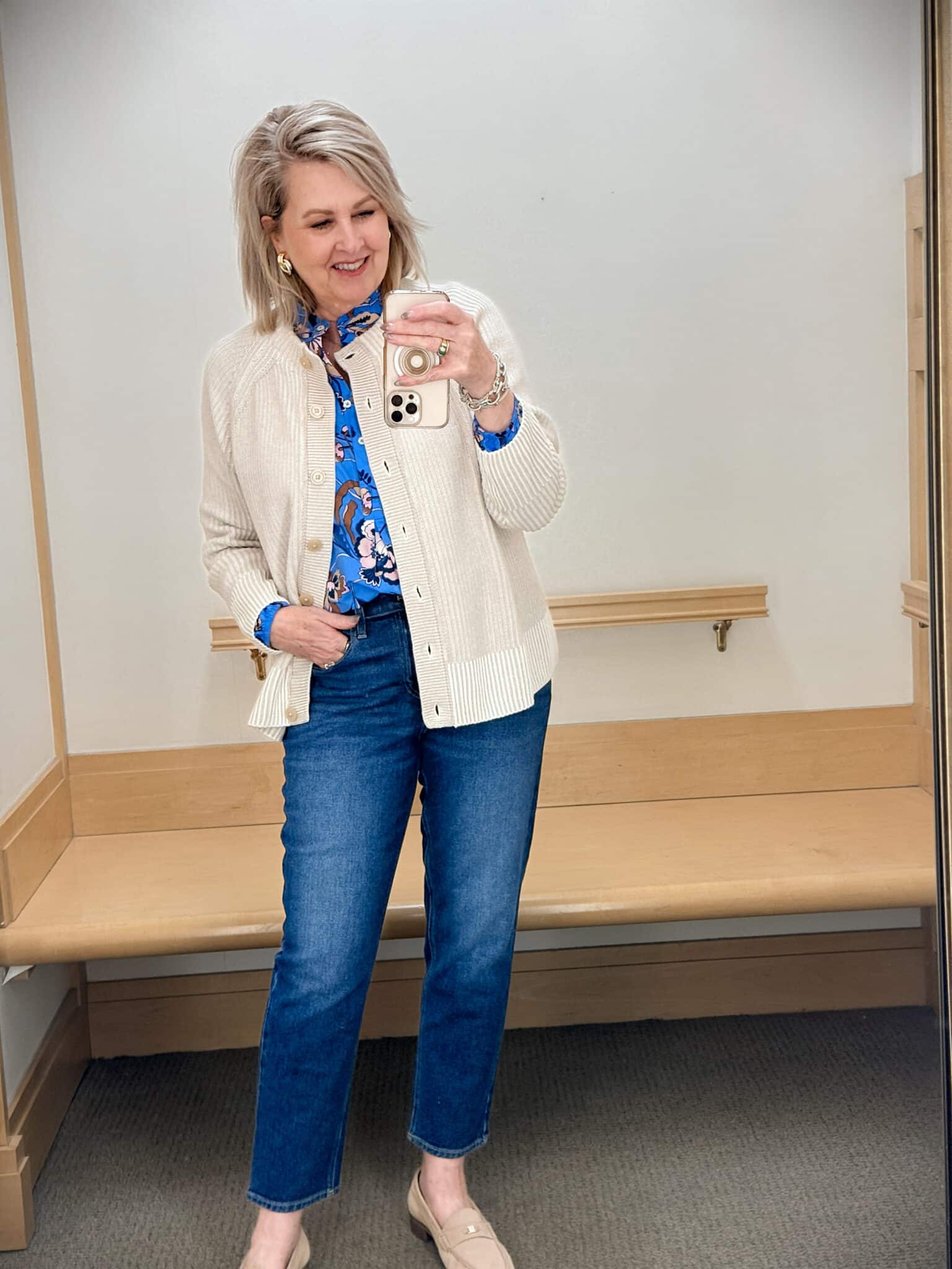 This Crewneck Cardigan over the Ruffle Popover adds warmth without weight and gives the outfit a soft, classic vibe. This is exactly why I love having a few good cardigans on hand.