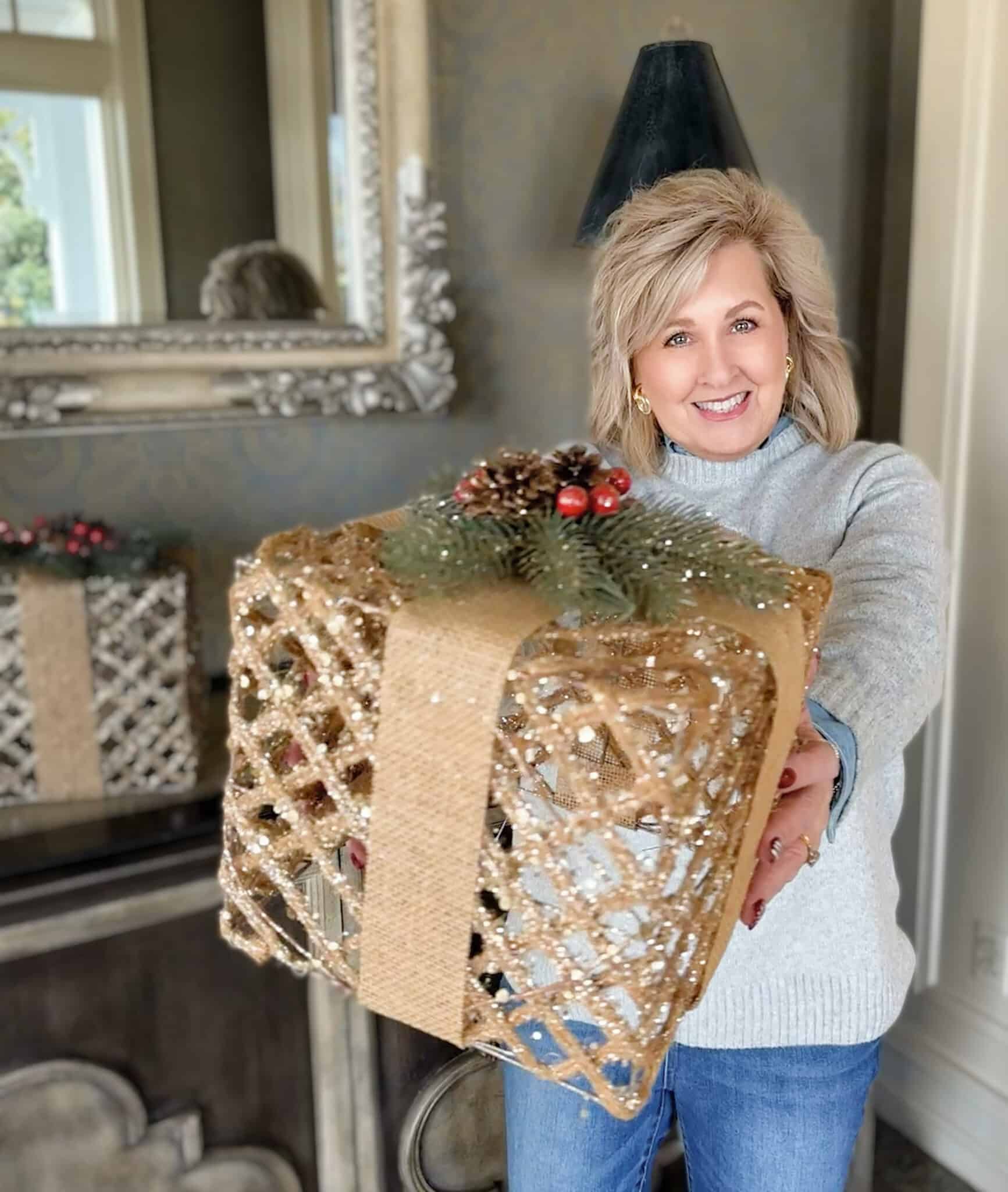 Before we jump into the sweaters, let’s start with this fun photo. If handing out oversized glittery presents ever becomes an Olympic sport, I expect at least a bronze. This is my way of sending you a little sparkle through the screen. Consider it an early Merry Christmas from me to you.