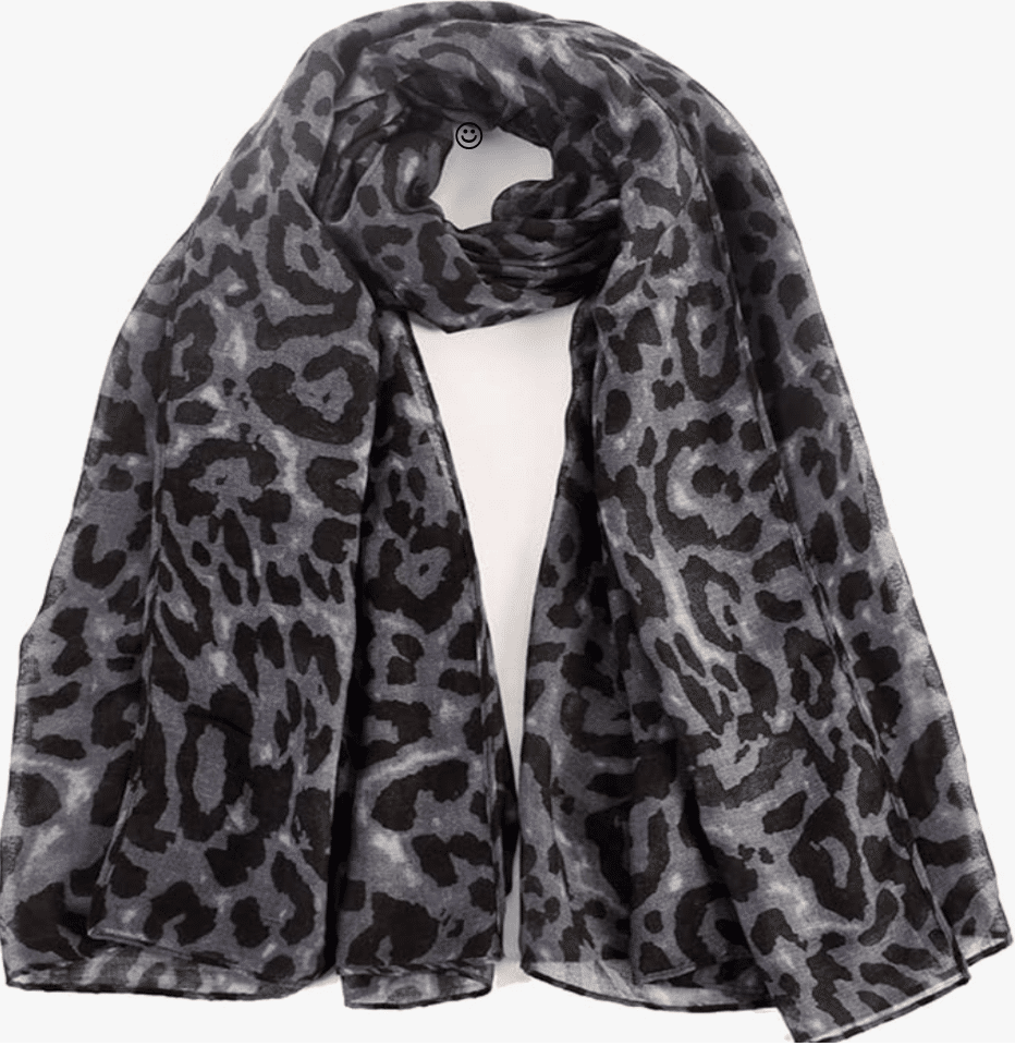 This gray leopard print scarf is the kind of accessory that pulls an outfit together in seconds. It adds texture and interest to winter grays without feeling bold or overdone. The print is soft and neutral, making it easy to wear and easy to mix, and the lightweight fabric drapes nicely without adding bulk around your neck.